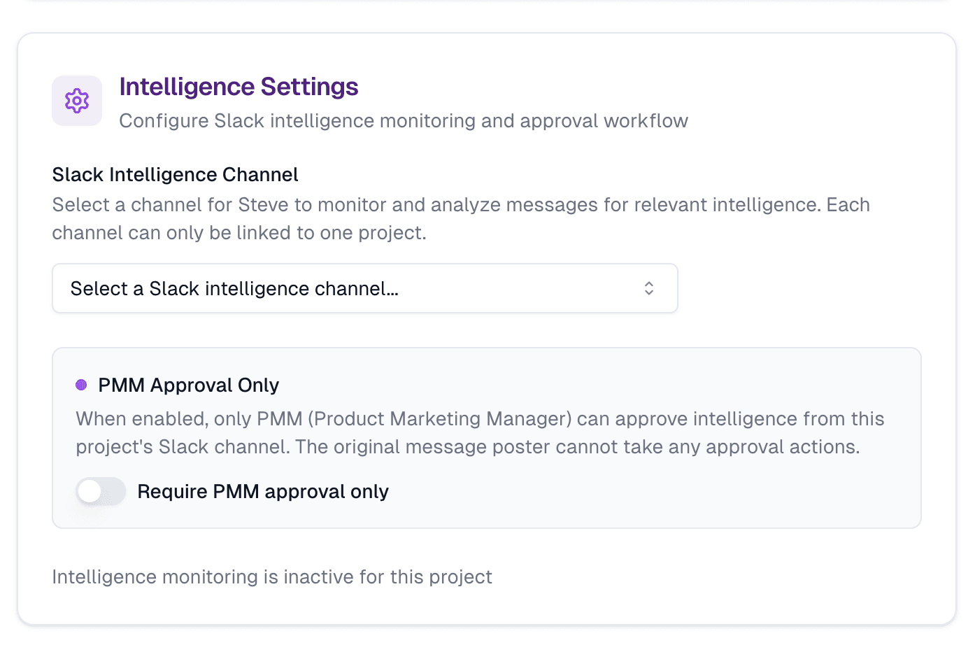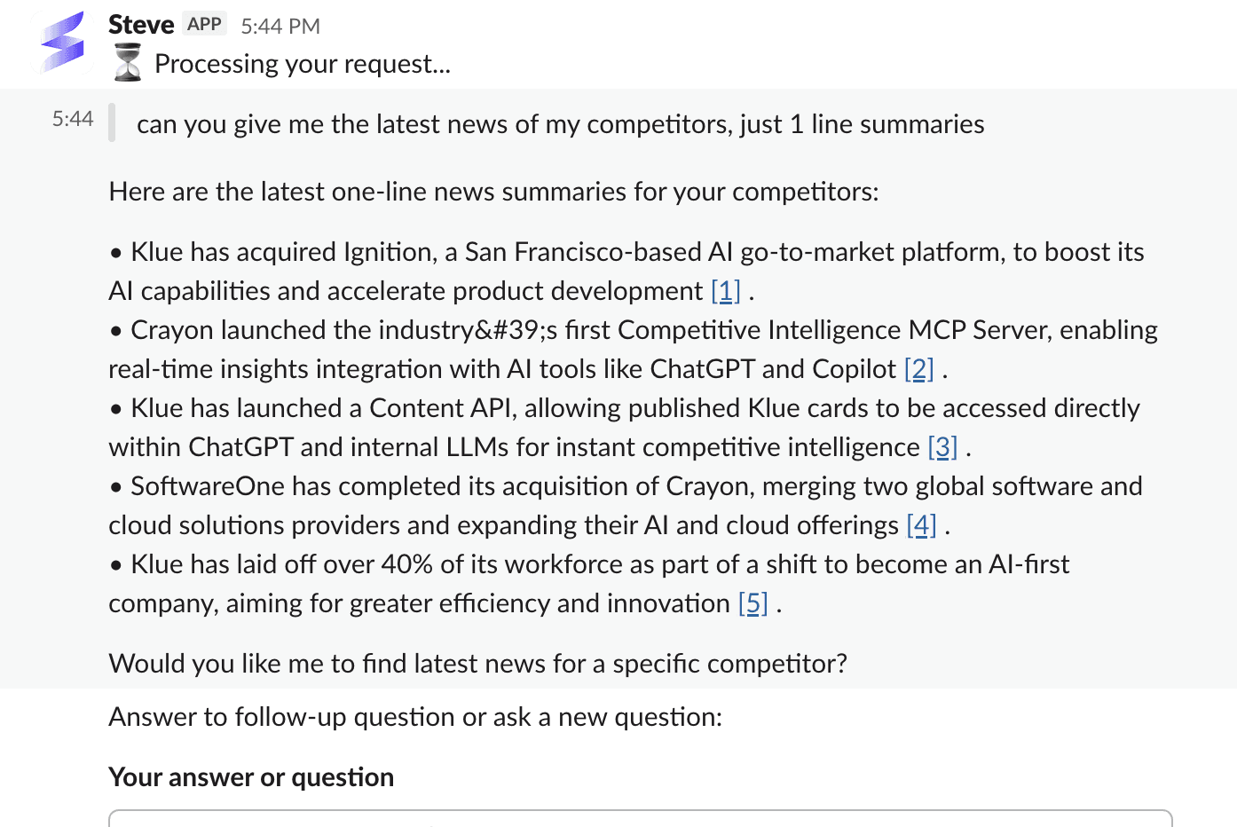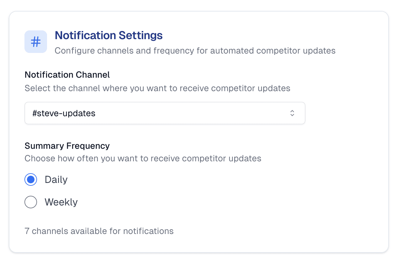 You can select a channel where Steve would send regular competitor updates, primarly pulling in news your competitors are making.